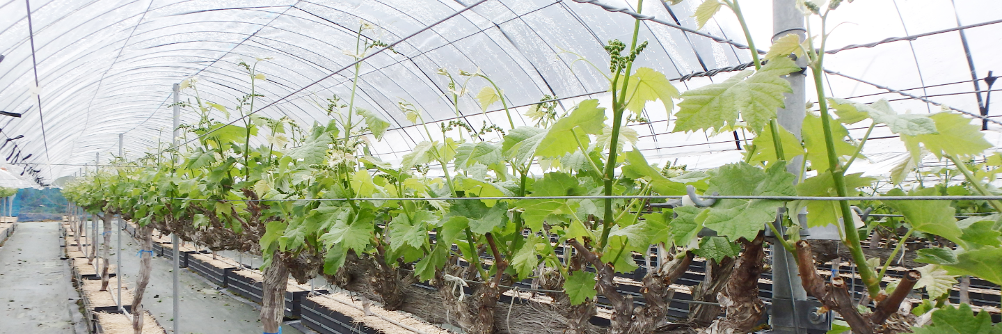 箱の中で育てることで根の成長する範囲を限定し、土壌の水分、肥料の量を的確にコントール。ぶどうの木1本1本と向き合い生長や収穫量を管理することで、質のよいぶどうを安定して提供しています。