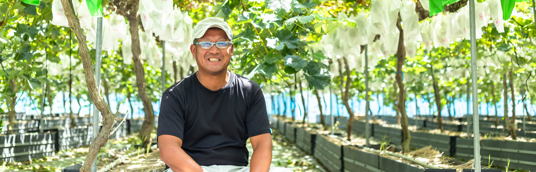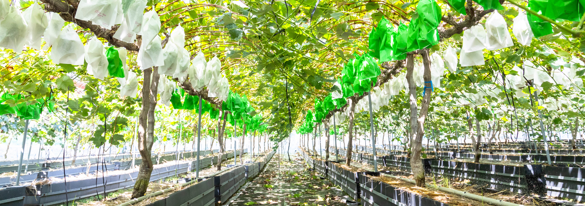 箱の中で育てることで根の成長する範囲を限定し、土壌の水分、肥料の量を的確にコントール。ぶどうの木1本1本と向き合い生長や収穫量を管理することで、質のよいぶどうを安定して提供しています。